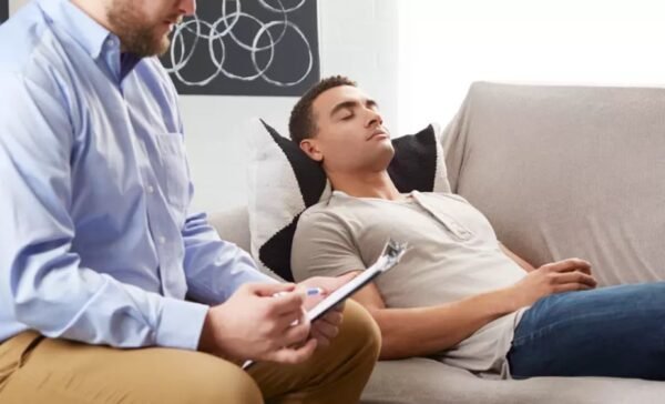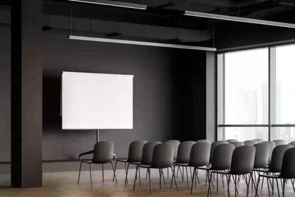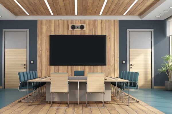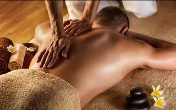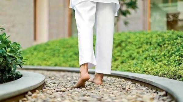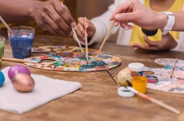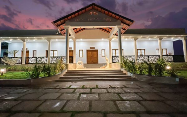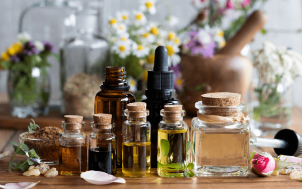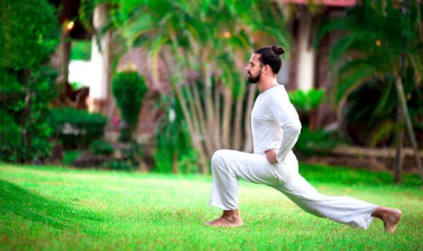 Back view of group of relaxed people exercising Yoga with their arms raised on a terrace.